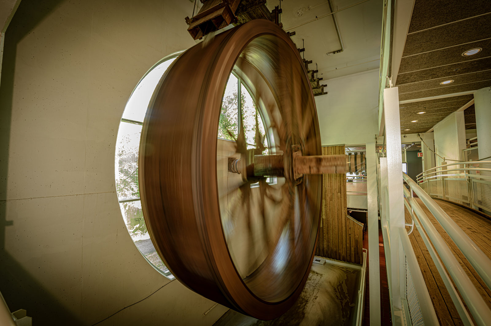 Etter mange års stillstand har vi med økonomiske midler fra venneforeningen fått restaurert det enorme vannhjulet i inngangspartiet. Vannhjulet er nå i full drift, med vann og det hele.