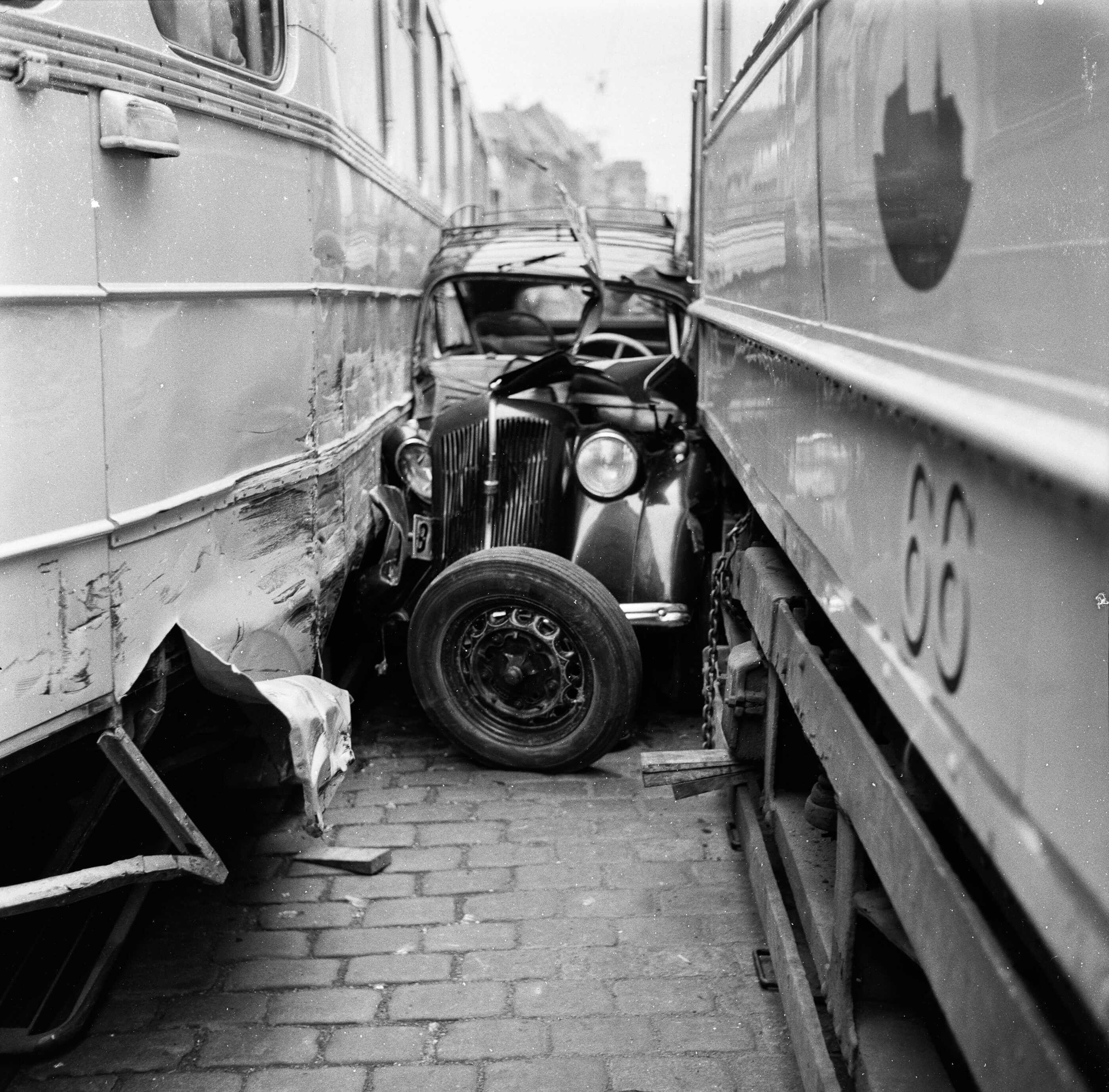 An accident where an Opel Kadett came between two trams in Storgata, 1955.