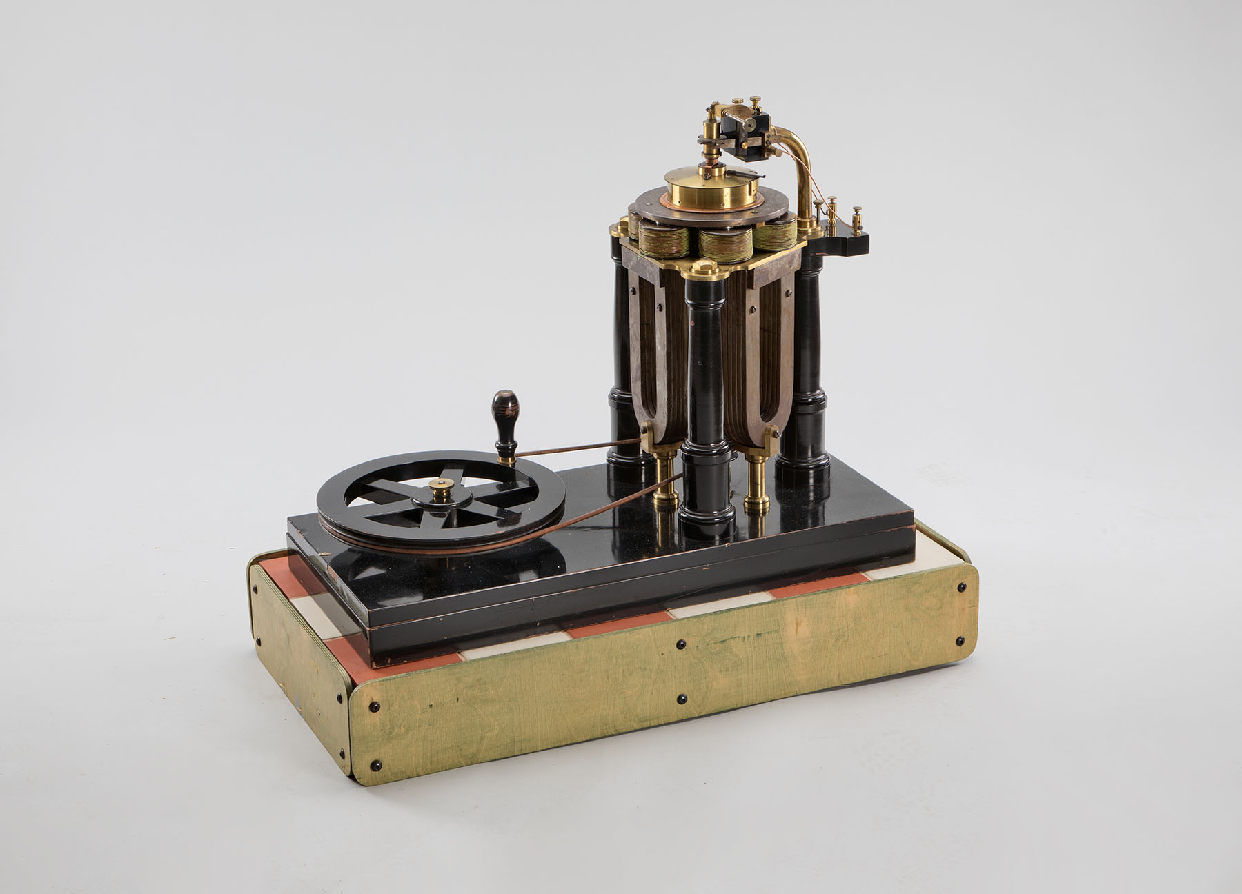 This device was built by instrument maker Andersen in Drammen in 1869 for the University's physics collection. The device made it possible to feel electricity. Electrotherapy was used in medicine to treat pain, paralysis and neuroses.