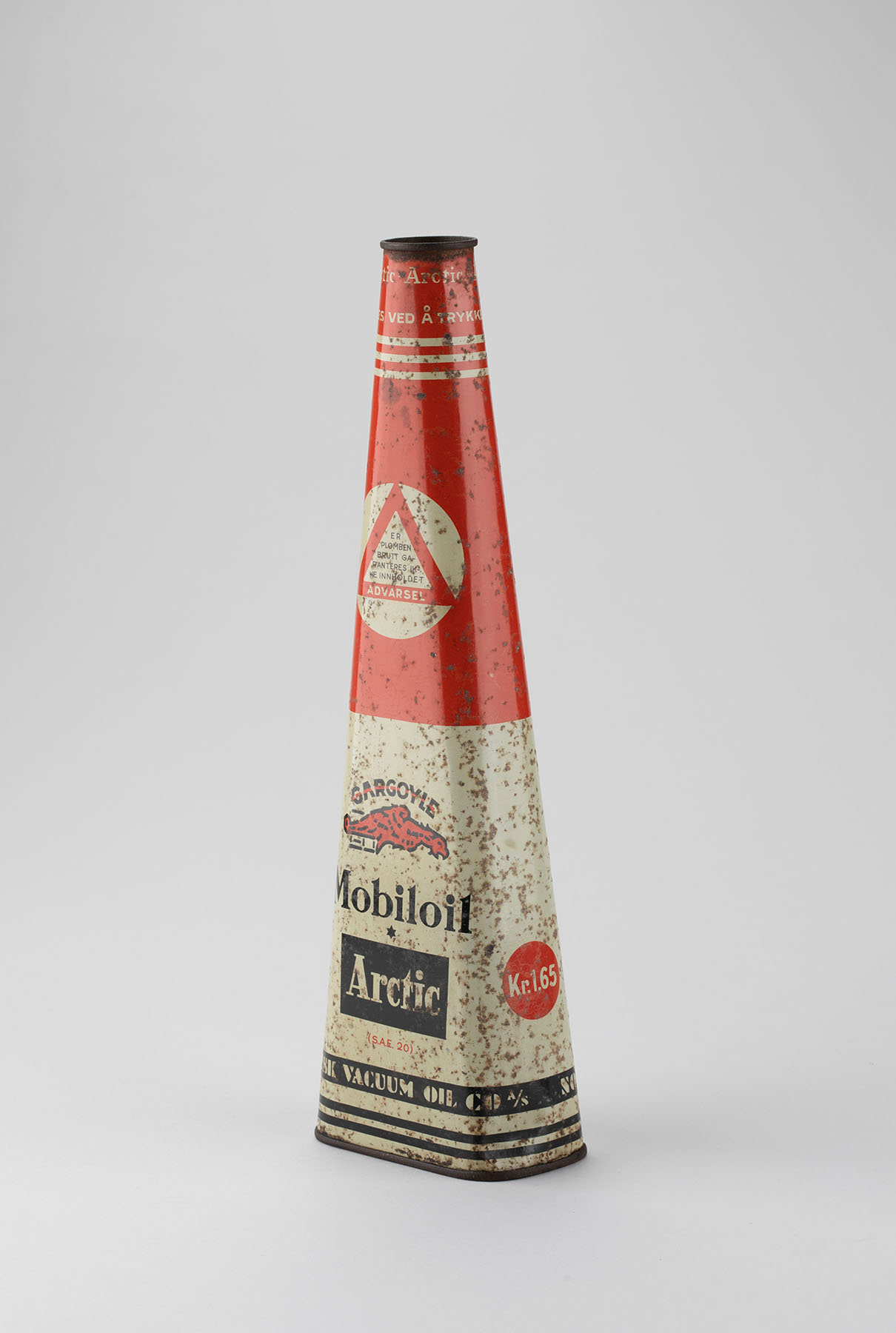 The pyramid-shaped oil can of 1 liter from Norsk Vacuum Oil was popular in the post-war period. The company imported and sold lubricating oils, especially to the fishing and merchant fleet. After the war, lubricating oils for vehicles became important. Lubricating oil protects moving parts in machines and engines, reduces friction and wear, water penetration and rust.