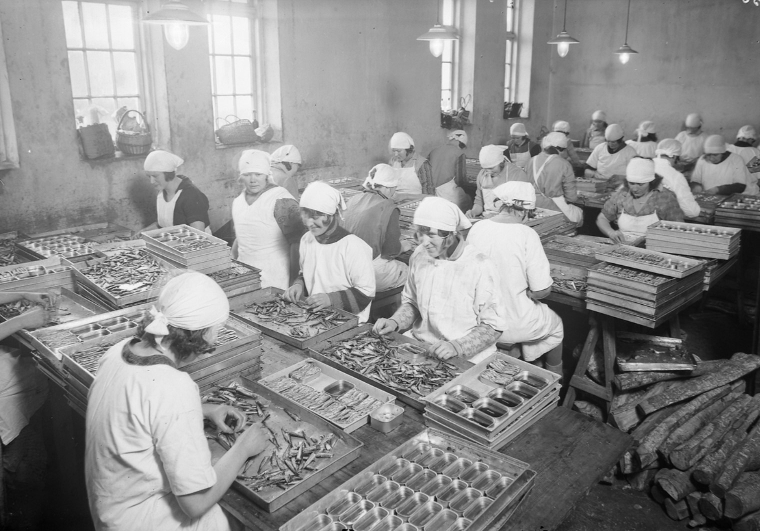 Fresh fish were put on ice and shipped by fast steamship or rail to customers in Europe. Large quantities of sprat and herring went to canneries. Here they were strung on thread, smoked and placed in oil in tins by hand. A medium-sized factory could produce approx. 30,000 boxes per day. The fishing industry was a workplace for many women.