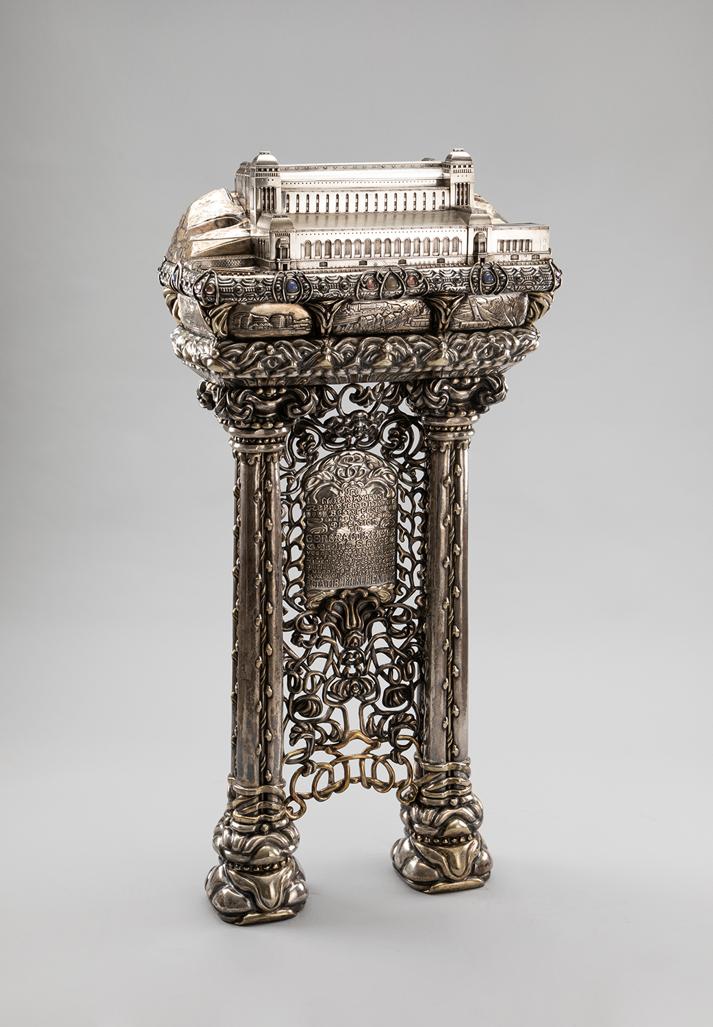 The silver statuette was a gift from the board of Norsk Hydro to director-general Sam Eyde on his 50th birthday in 1916. The lavish statuette can stand as an expression of the great value private players could earn from Norwegian natural resources. At the top, Såheim power station in Rjukan towers over five of Hydro's hydroelectric plants and factories. Produced by the goldsmith company J. Tostrup.