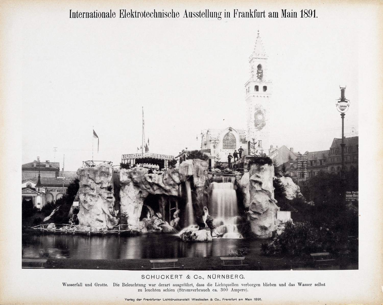 At the electrotechnical exhibition, high-voltage transmission of three-phase alternating current was introduced for the first time with the transmission of power 175 kilometers between the power plant in Lauffen and the exhibition area in Frankfurt. The installation depicted an artificial waterfall and a grotto and was a spectacular part of the exhibition.