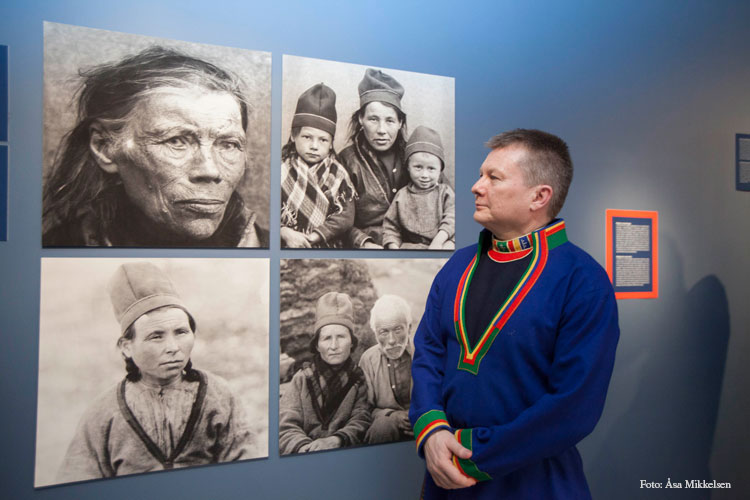 The pictures on the wall show: Inga Andersdatter, born in Sweden approx. 1830, Inger Nikolaisdatter Tjikkom (b. 1879), with children Sara and Peder, Tjierrek-Ánne (Anne Abmutsdatter Kurak) (1882–1948) and Finne Johnsen Ráhka (1830–1918). In front of the pictures is Lars Magne Andreassen, director of the Árran Lule Sami Centre.