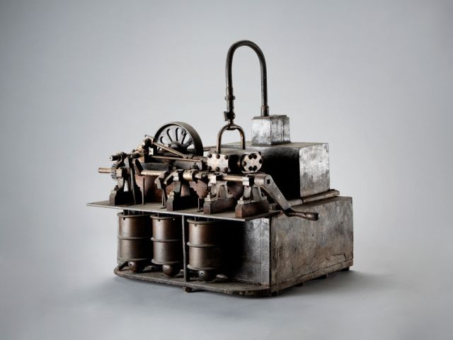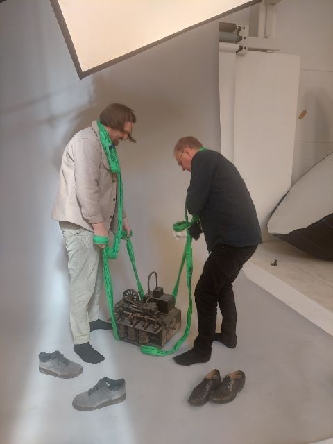 Håkon og jeg er på magasinet vårt på Gjerdrum. Her løfter vi på en evighetsmaskin – en ekte Perpetuum Mobile. Og den er svintung, veier over 80 kg! Her klargjør vi maskinen for fotografering, og under ser du endelig resultat, tatt av vår fotograf Håkon, som tar helt fantastiske bilder.