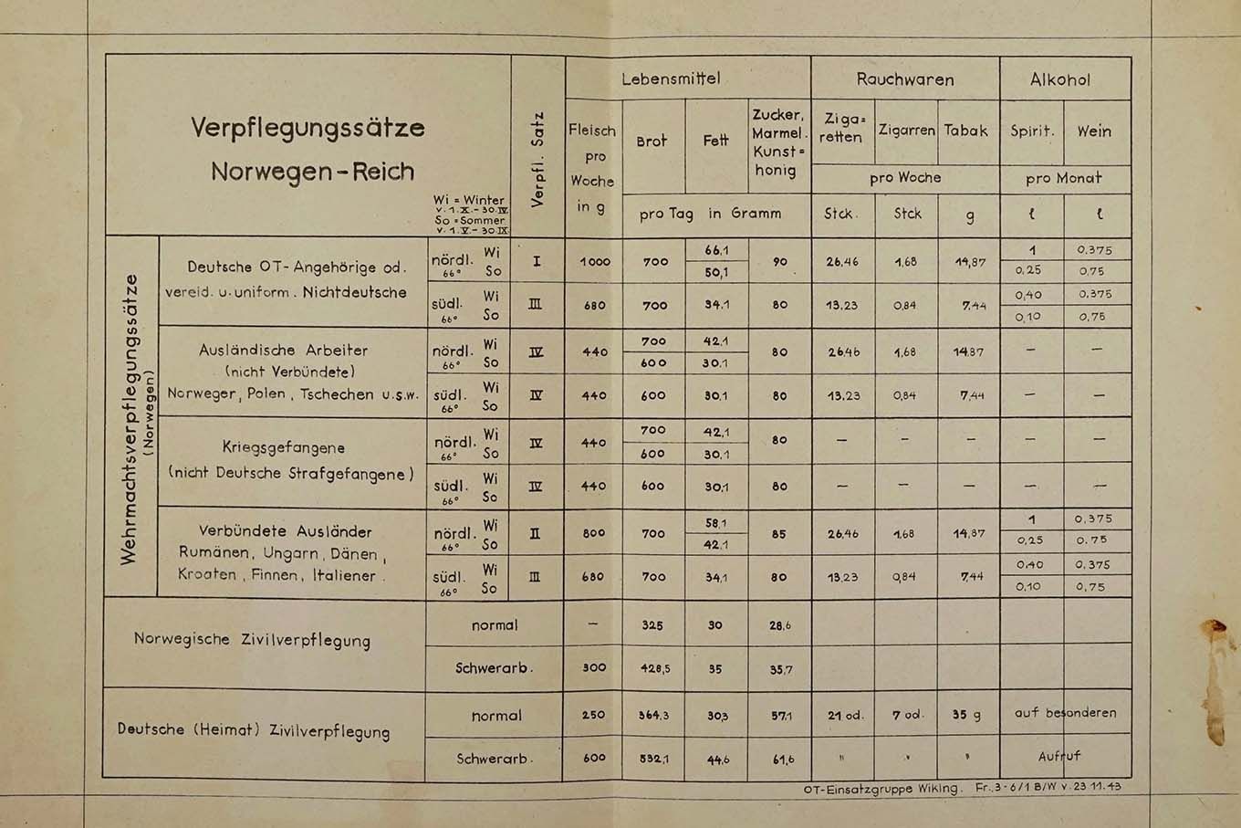 Tyske OT-arbeidere hadde best tilgang på mat. I utgangspunktet skulle arbeidere fra land som var Tysklands allierte ha tilsvarende rasjoner, men som regel fikk de langt mindre. Arbeidere fra okkuperte land, for eksempel Norge, måtte finne seg i enda lavere rasjoner. Generelt spiste arbeidere fra Øst-Europa mindre og dårligere enn arbeidere fra land i Vest. At man faktisk fikk det man var lovet, var ingen selvfølge. Rasjonene ble tilpasset lokale forhold. Brød ble ofte supplert med kål og poteter, kjøtt ble erstattet av fisk. Fangene led mest under matmangelen. For de serbiske, tyske og sovjetiske fangene som kom til Norge i 1942, var forsyningssituasjonen katastrofal. Lederen av Einsatzgruppe Wiking, Willi Henne, tok flere initiativer som hadde til hensikt å bedre forholdene.