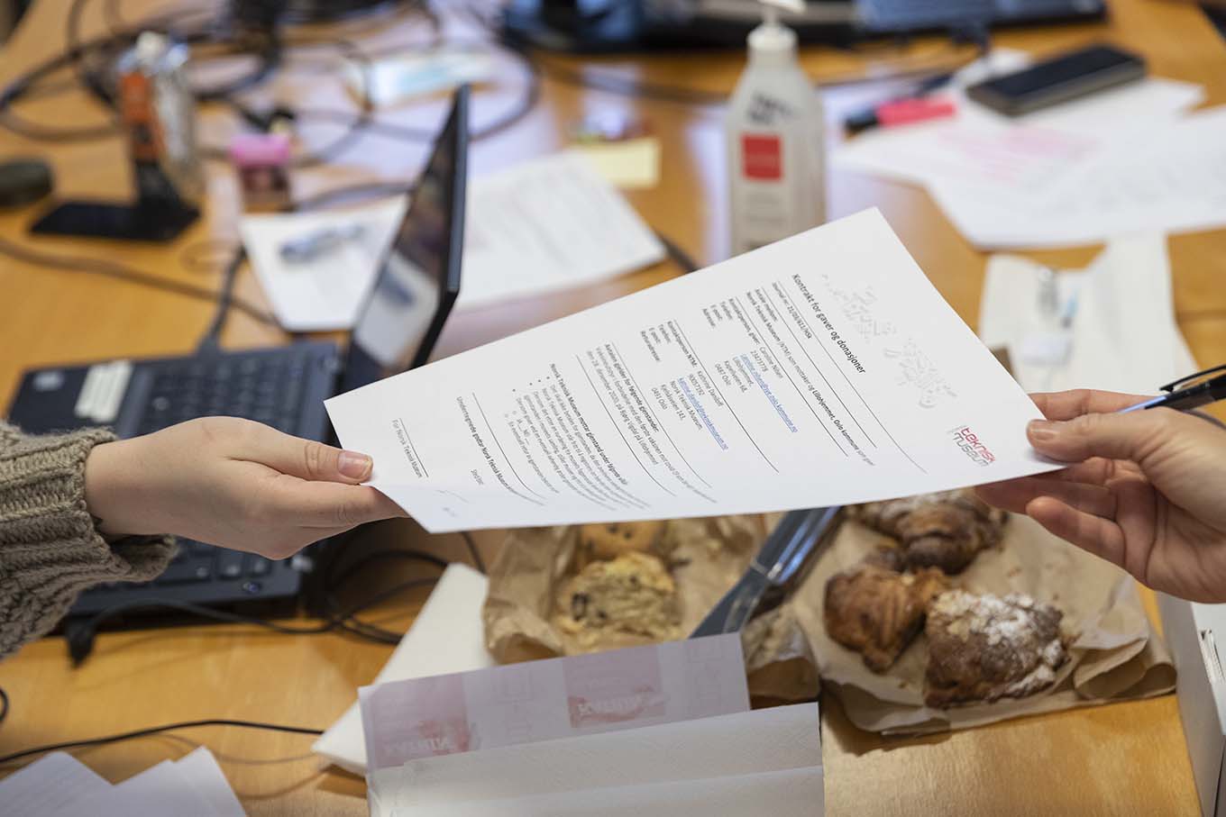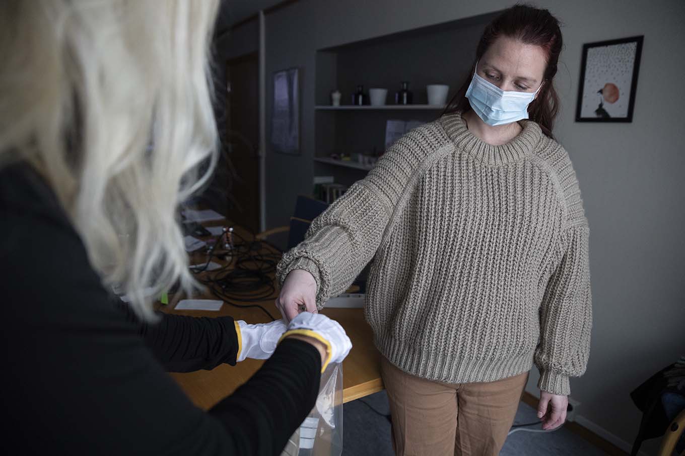 Utstyret som ble brukt da Bjørg Vigdal (87) ble vaksinert, ble en museumsgjenstand med en historie verd å ta vare på. Her leverer Caroline Nilsen utstyret til Nasjonalt medisinsk museum ved Teknisk museum.