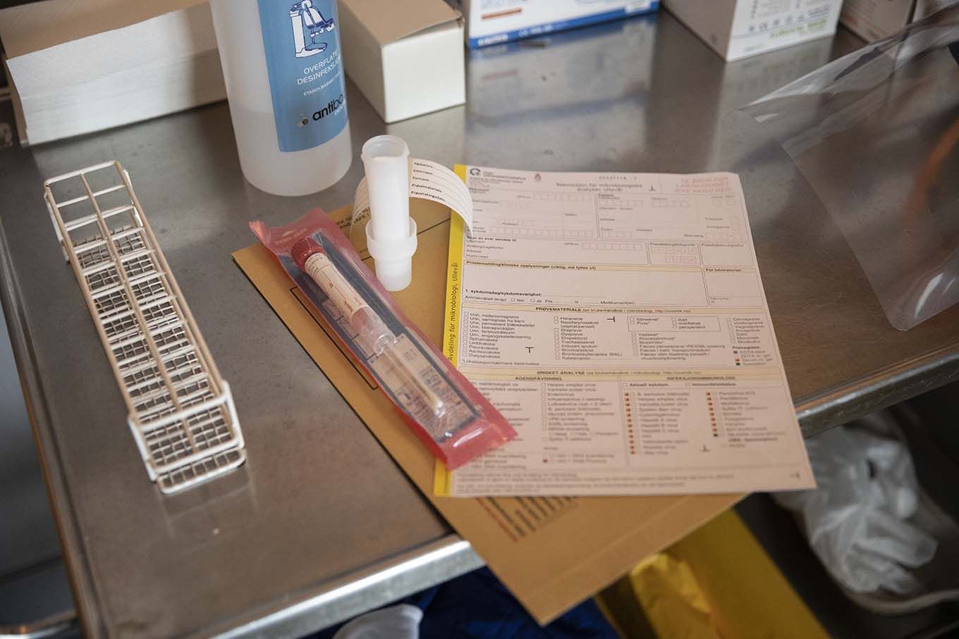 Prosedyren for å ta på og av smittevernutstyret tar gjerne 10 minutter inne i smitteslusen, og det skal være en person som står utenfor og påser at alt går riktig for seg.