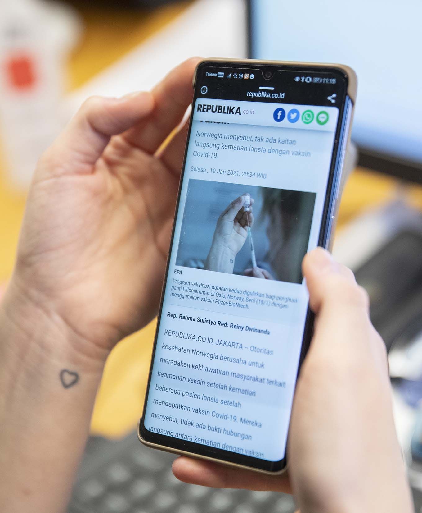Susanne Utberg viser bilde av hendene hennes, som holdt en vaksine, i en nyhetssak fra Jakarta.
