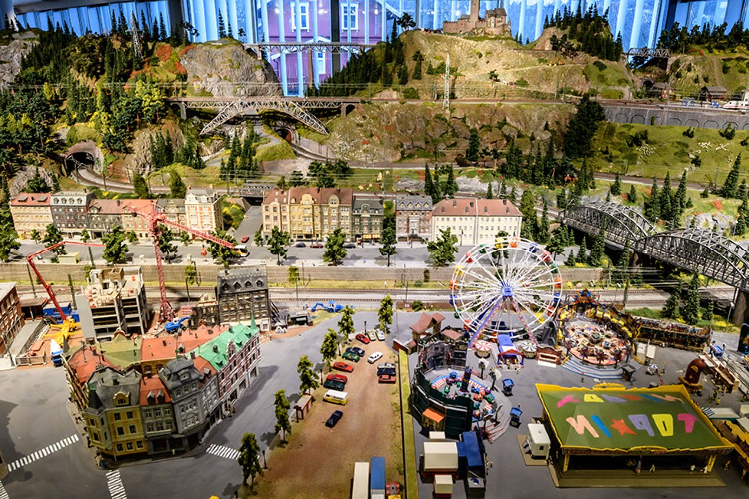 Modelljernbanen viser en detaljert miniatyrverden med fire tog som kjører samtidig, hver med ulikt antall vogner. Den inkluderer et innholdsrikt miniatyrtivoli med karuseller og attraksjoner. Modelljernbanen dekker et område på 3 x 8 meter og er utstyrt med små, detaljerte scener og historier. Denne installasjonen gir en omfattende visuell opplevelse og er et betydelig element i museets samling.